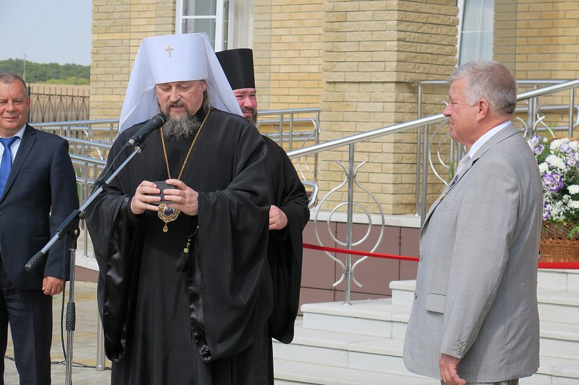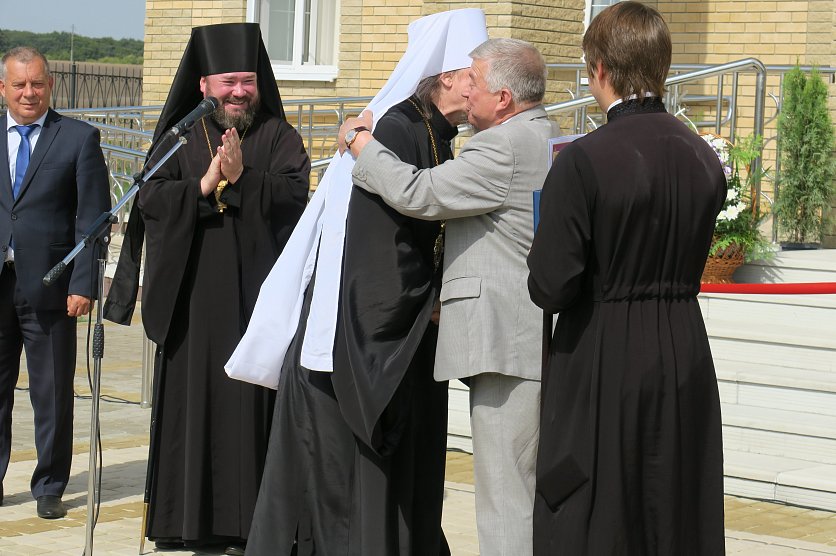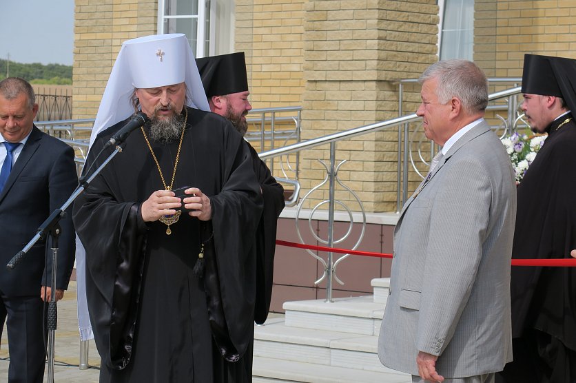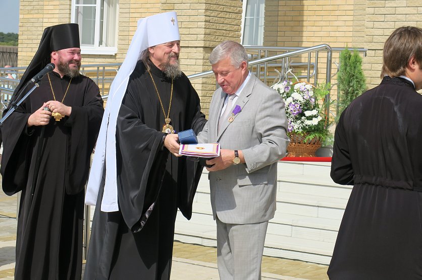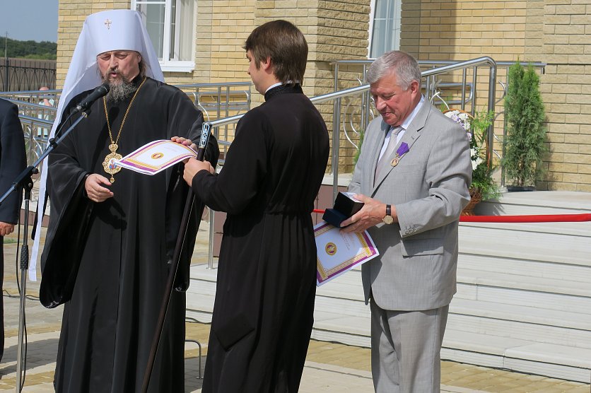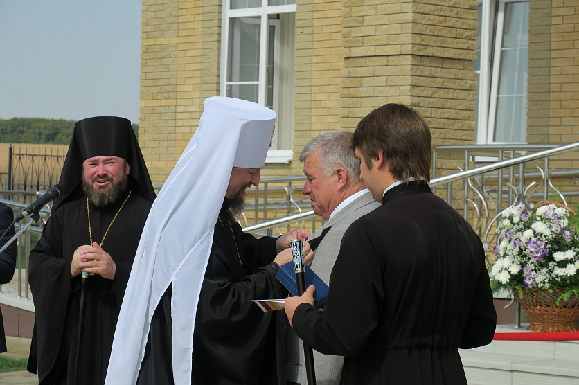 Губкин Новости Новости Белгородский митрополит наградил губкинского главу эксклюзивными часами и медалью Белгородский митрополит наградил губкинского главу эксклюзивными часами и медалью Лариса Ульяненко 01.09.2018 12:33 В Губкине и области 2637 Фото: Ценные подарки вручил сам митрополит, фото Ларисы Ульяненко 31 августа на церемонии открытия нового здания епархии губкинский глава получил сразу два ценных подарка. Так, по словам митрополита Иоанна, вручавшего их, продолжается празднование 70-летие Анатолия Кретова, начавшегося ещё в мае. Награды - достоин! Фото: Лариса Ульяненко. – Сердечно благодарю патриарха Кирилла и Владимира Путина за поддержку идеи строительства духовно-просветительских центров. Но нового центра не было бы, если бы и не Анатолий Алексеевич. Именно при нём город стал таким. При нём закладывался камень будущего кафедрального собора, при нём с 1996 года появилось четыре новых церкви. И вот теперь ещё это здание, – сказал владыка Иоанн. – За большие заслуги Анатолия Кретова отмечаем сегодня высшей наградой Белгородской митрополии, медалью Святителя Иосафа. Аксиос (достоин, греч.), Анатолий Алексеевич! Часы для главы собирали в митрополии, уверяет владыка. Фото: Лариса Ульяненко. А в придачу к ней, улыбаясь, митрополит, достал чёрную коробочку – эксклюзивные часы. Они собраны в нашей митрополии. Награждение Анатолия Яковлева. Фото: Лариса Ульяненко. "Аксиос" прозвучало и в честь Анатолия Ивановича Яковлева, руководителя «Ремстроя», строившему новое здание. Алексей Котенёв получает грамоту от епископа Софрония Фото: Лариса Ульяненко. Также за помощь в возведении нового центра замглавы по строительству и ЖКХ Алексею Котеневу вручили архиерейскую грамоту. Ими же наградили Виктора Семендяя (капстроительство) и Александра Елисеева (ООО «Ремикс»). Елисеев и Семендяй получили архиерейские грамоты. Фото: Лариса Ульяненко. Епископу же Софронию митрополит подарили икону «Преображение Господне», написанную владыкой Саввой. Икона "Преображение" будет хранить духовный центр и митрополию. Фото: Лариса Ульяненко. – Желаю, чтобы отсюда исходил мир! – вручая презенты, сказал владыка. Фоторепортаж: митрополит Белгородский митрополит Иоанн наградил Кретова новости Губкина эксклюзивные часы медаль святителя Иосафа Мы в Telegram Вернуться к списку новостей Предложить новость