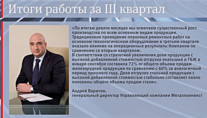 Губкин ТВ и издания Наше ТВ Металлоинвест подвёл итоги работы в 3 квартале 2018 года Металлоинвест подвёл итоги работы в 3 квартале 2018 года 14.11.2018 17:09 Наше ТВ Контент-менеджер 577 0 Металлоинвест подвел итоги работы за третий квартал 2018-го года. Этот период Компания завершила с ростом производства и отгрузки по многим видам основной товарной продукции. Наше ТВ
